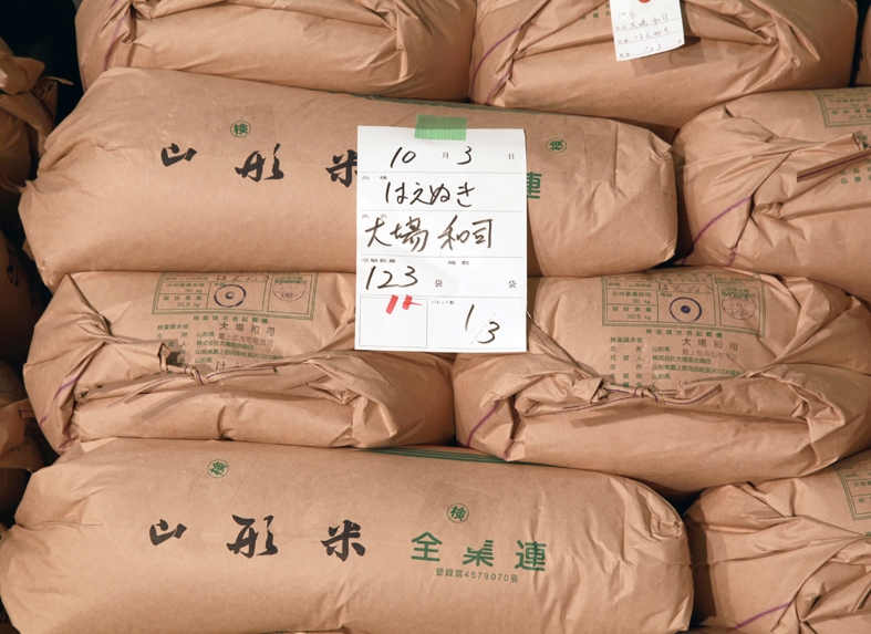 生産者が生産した玄米を、農産物検査員2名で等級格付けを行います。 その際、生産者、品種、日別に食味計で計測します。 秋の収穫時には、約1000点を測定します。 検査された米は、パレットで等級、品種、生産者別に低温倉庫で保管しています。